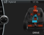 Status of the hybrid system and current operating conditions are presented in two locations. The most important information is shown in the instrument cluster, separated according to operating mode. Further information and technical explanations are shown in the Central Display.