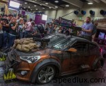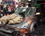 This model is a follow-up to last year’s Elantra Coupe Zombie Survival Machine which was presented at the same venue. The customised car comes with a wide variety of modifications to survive the zombie apocalypse like the new hood featuring a double-barrel shotgun and sand bags. The front bumper also comes with two quick-change chainsaws and horde plow, along with front-grille mounted saw blades and door-attached flame throwers.